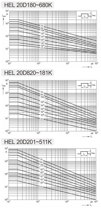 14D滿足20D的(de) 脈沖性能(néng)要(yào)求 14D instead of 20D 舉例2 Example HEL14D561KX能(néng)達到(dào) 6KV/3KA 100次 HEL14D561KX reach 6KV/3KA 100 times |