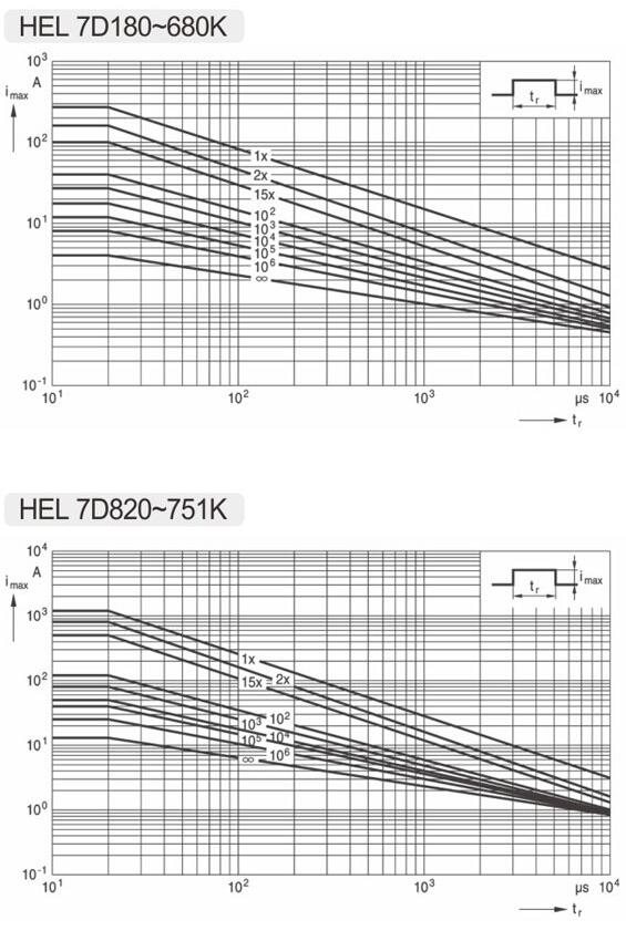 14D滿足20D的(de) 脈沖性能(néng)要(yào)求 14D instead of 20D 舉例2 Example HEL14D561KX能(néng)達到(dào) 6KV/3KA 100次 HEL14D561KX reach 6KV/3KA 100 times |