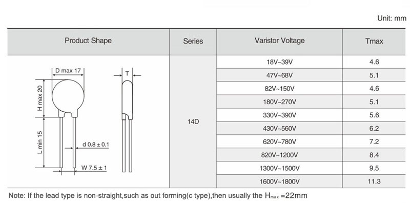 | Part No. | Varistor Voltage | Maximum Allowable Voltage | Maximum Clamping Voltage | Withstanding Surge Current ™ | Rated Wattage | Energy | Typical Capacitance | Datasheet Download | ||